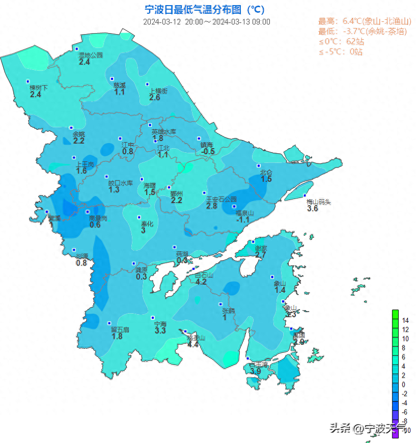 受冷空气和辐射降温影响,今天早晨市区(鄞州国家气象站)的最低气温2.2℃,余姚茶培站只有-3.7℃,上班上学路上还是有些冷飕飕的。