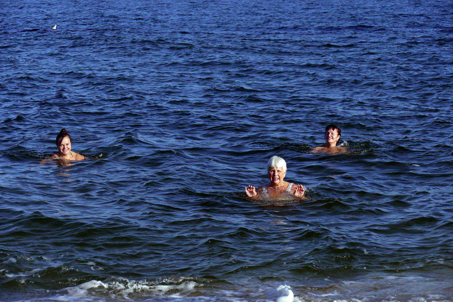 当地时间2023年1月2日,乌克兰敖德萨,三名女子在冬天的黑海游泳,这座城市经历了百年来1月最高温,达到了16摄氏度的创纪录气温。