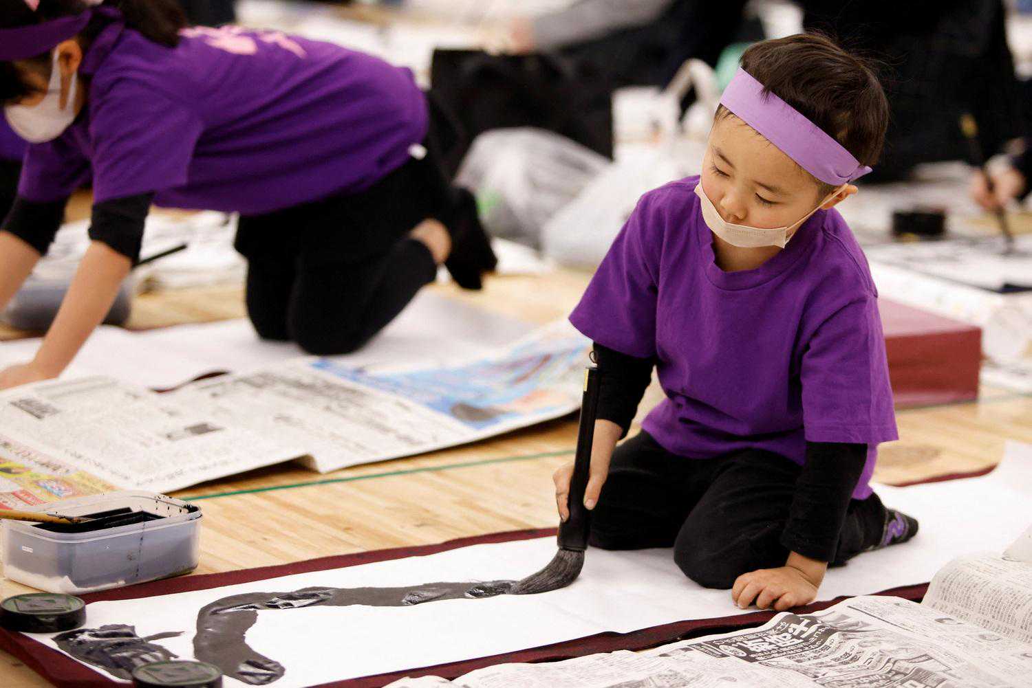 当地时间2023年1月5日,日本东京,当地举行新年书法比赛,小参赛者挥毫泼墨。