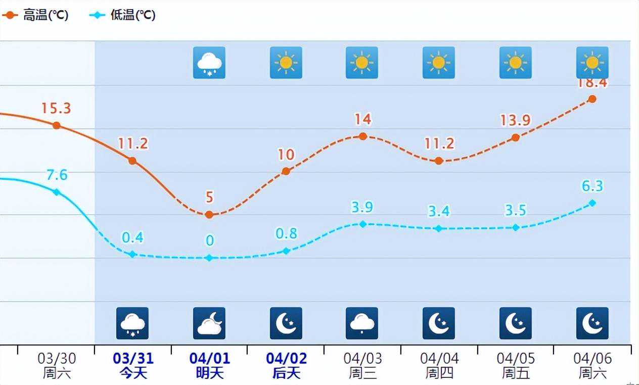 受降水天气影响,乌鲁木齐气温将明显下降,预计4月1日最低温将降至0℃左右,最高温为5℃左右。