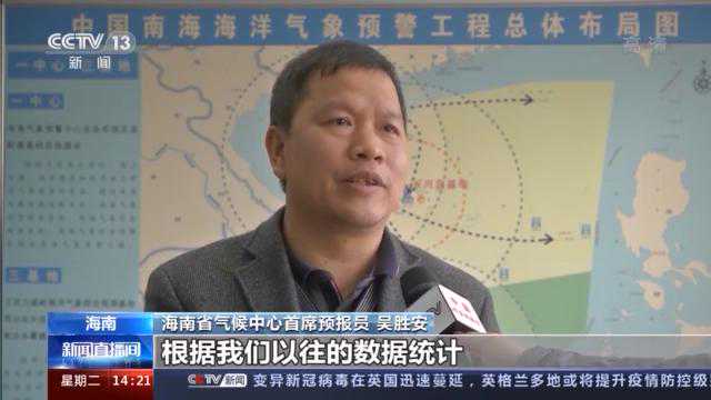 海南省气候中心首席预报员吴胜安:12月份影响海南省的台风并非罕见,就是平均每年是0.6个,大约(每)两年就有一个,上一次出现台风就是2019年12月,也有出现一个台风影响海南省,台风等级是台风级。