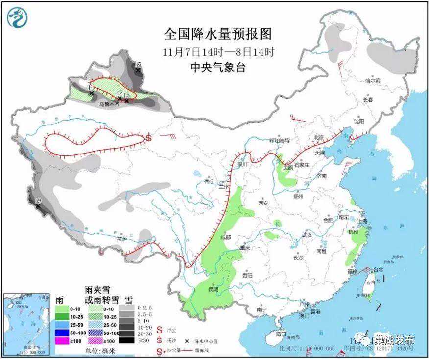根据预报显示,这股强冷空气影响雨雪范围较广、降温猛,南方也将加入雨雪、降温阵营。长江及其以北大部地区平均气温将下降6~10℃,局部超12℃。西北、华北、东北有小到中雪或雨夹雪,黄淮、江南、西南等地有小到中雨,长江中下游地区将迎短暂弱降雨以小雨为主。