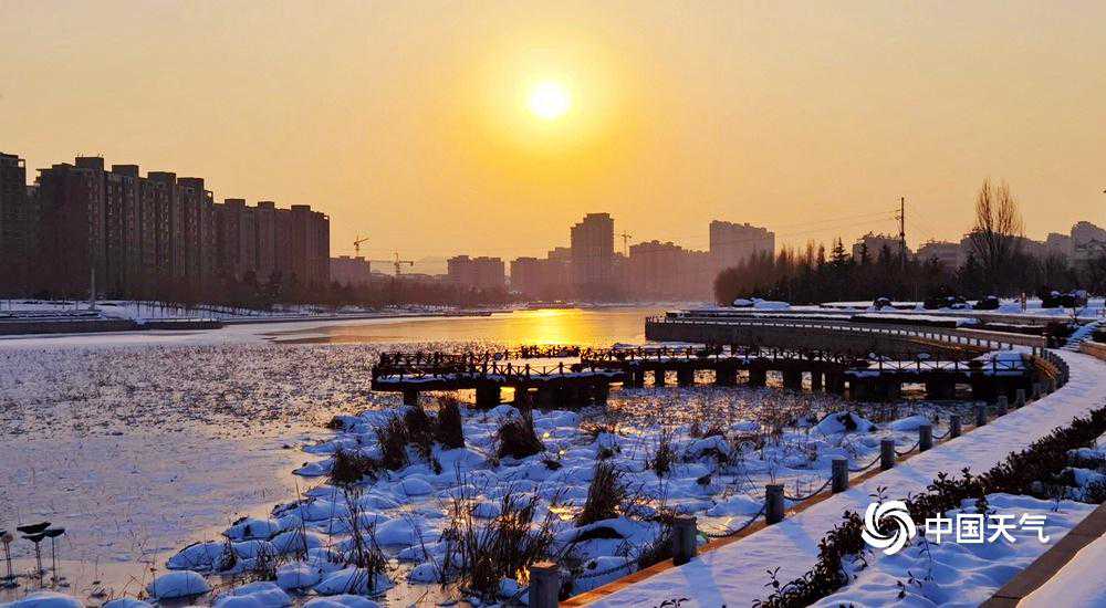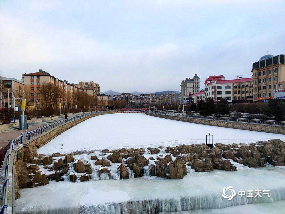 1月3日,山东威海气温低迷,天气寒冷,文登区内的抱龙河结冰,在阳光照耀下,银光闪闪。(图/赵学军)