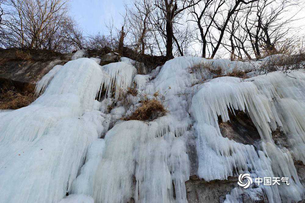 1月3日,北京天气寒冷,门头沟瓜草地景区出现千姿百态的冰瀑群,冰峰倒挂,层层叠叠,晶莹剔透,洁白无瑕的冰柱悬挂在巨大的山崖之上,十分壮观。(图/樊甲山)