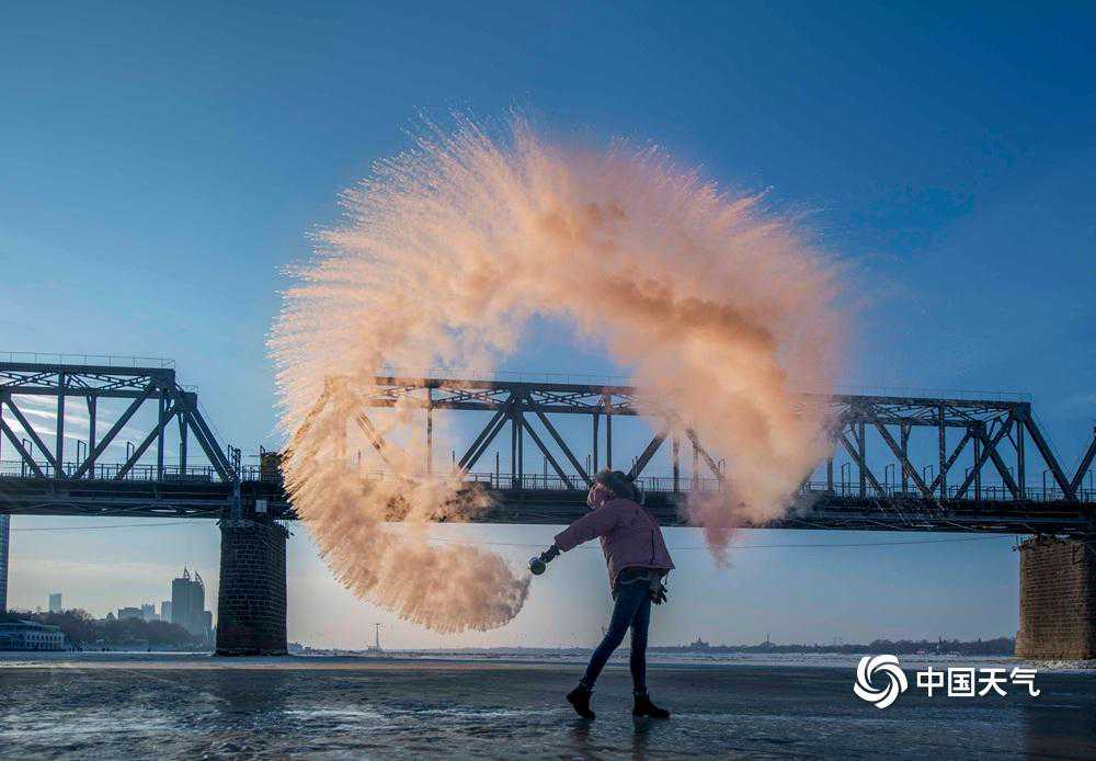 1月5日,哈尔滨已进入隆冬时节,一市民将滚开的热水泼向空中,瞬间形成冰雾。(图/林松)