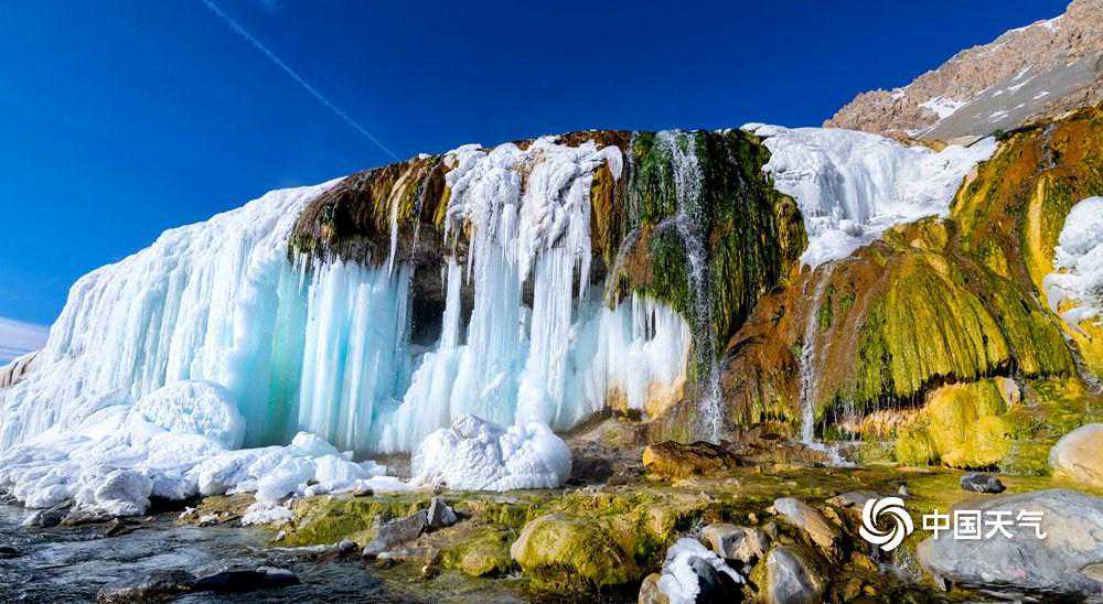 1月2日,青海省门源回族自治县天气寒冷,其境内的祁连山岗什卡雪峰下的多彩冰瀑,在高原蓝天白云的映村下,气势磅礴,蔚为壮观。(图/赵海梅)