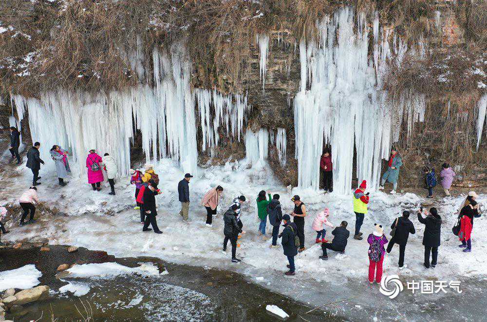1月7日,山东省枣庄市山亭区的滴水崖因连日低温,泉水滴水冰封,形成了晶莹剔透的冰瀑景观,吸引大量游客前来“打卡”。(图/李宗宪)