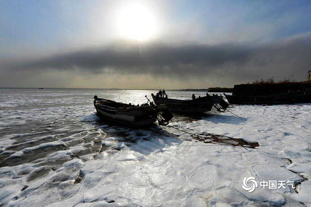 1月6日,山东省青岛市降温猛烈,沿海地区滩涂出现封冻,养殖户的渔船被海冰冻结。(图/王海滨)