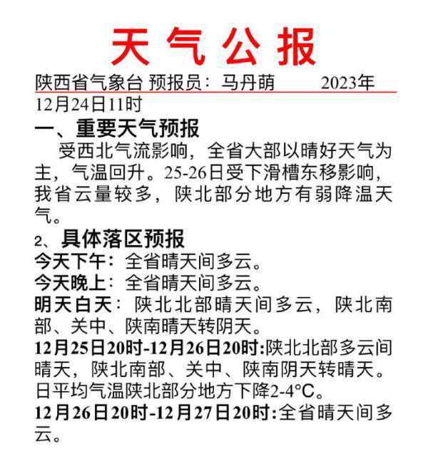 昨日全省大部地区多云到晴天,全省最高气温-10~11℃,最高白河11.2℃,西安站2.9℃;其中,陕北南部、关中大部、陕南北部较22日升高3~10℃。
