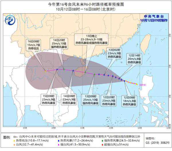 预计,该台风将以每小时20公里左右的速度向西偏北方向移动,强度继续增强,并将于13日晚上在海南岛东部到广东雷州半岛一带沿海登陆(23-28m/s,9-10级)。