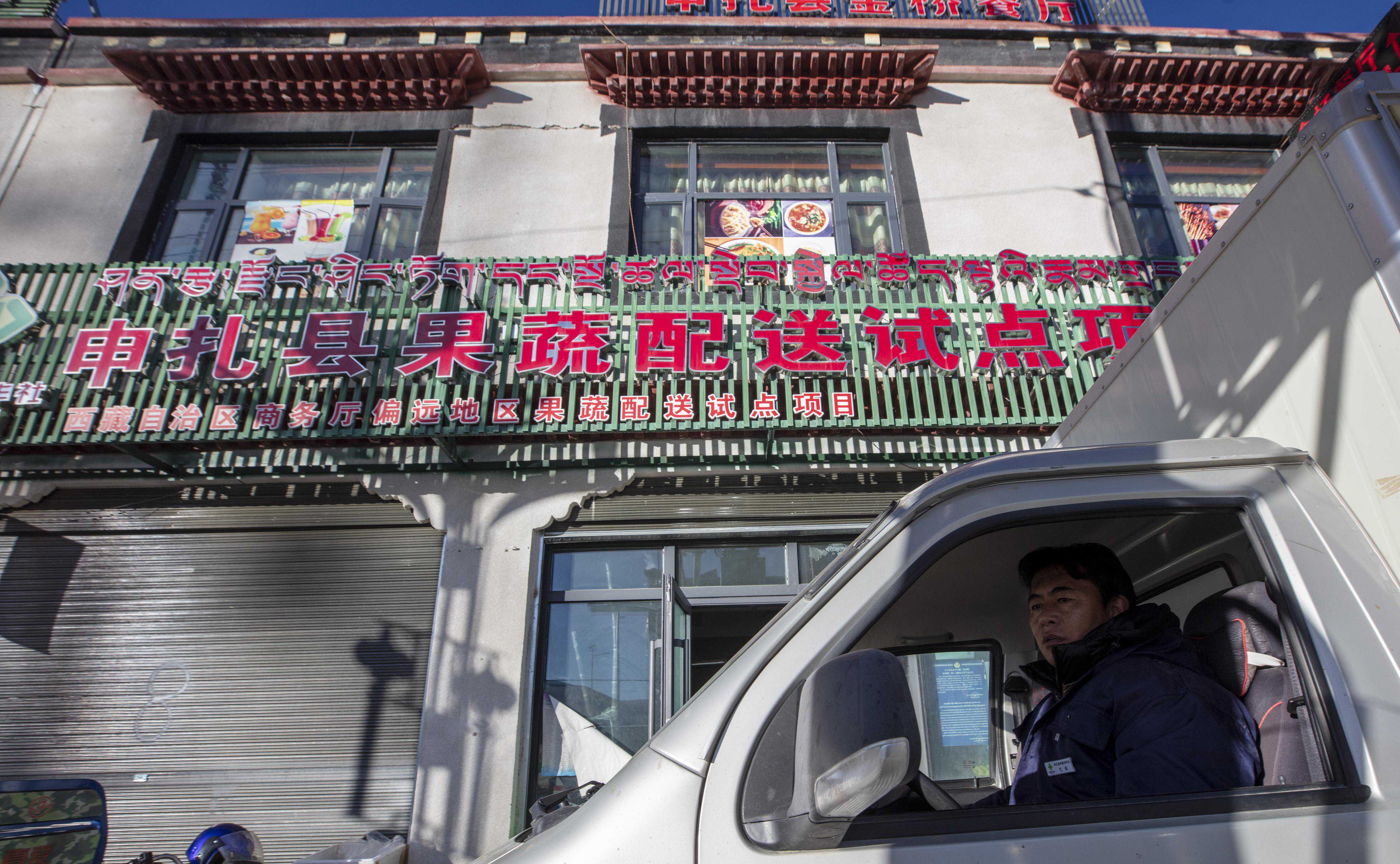 申扎县供销合作社的配送员巴拉从县城总店出发,为马跃乡贝嘎四村偏远乡镇果蔬配送试点项目直销点运送新鲜果蔬(1月5日摄)。新华社记者姜帆摄