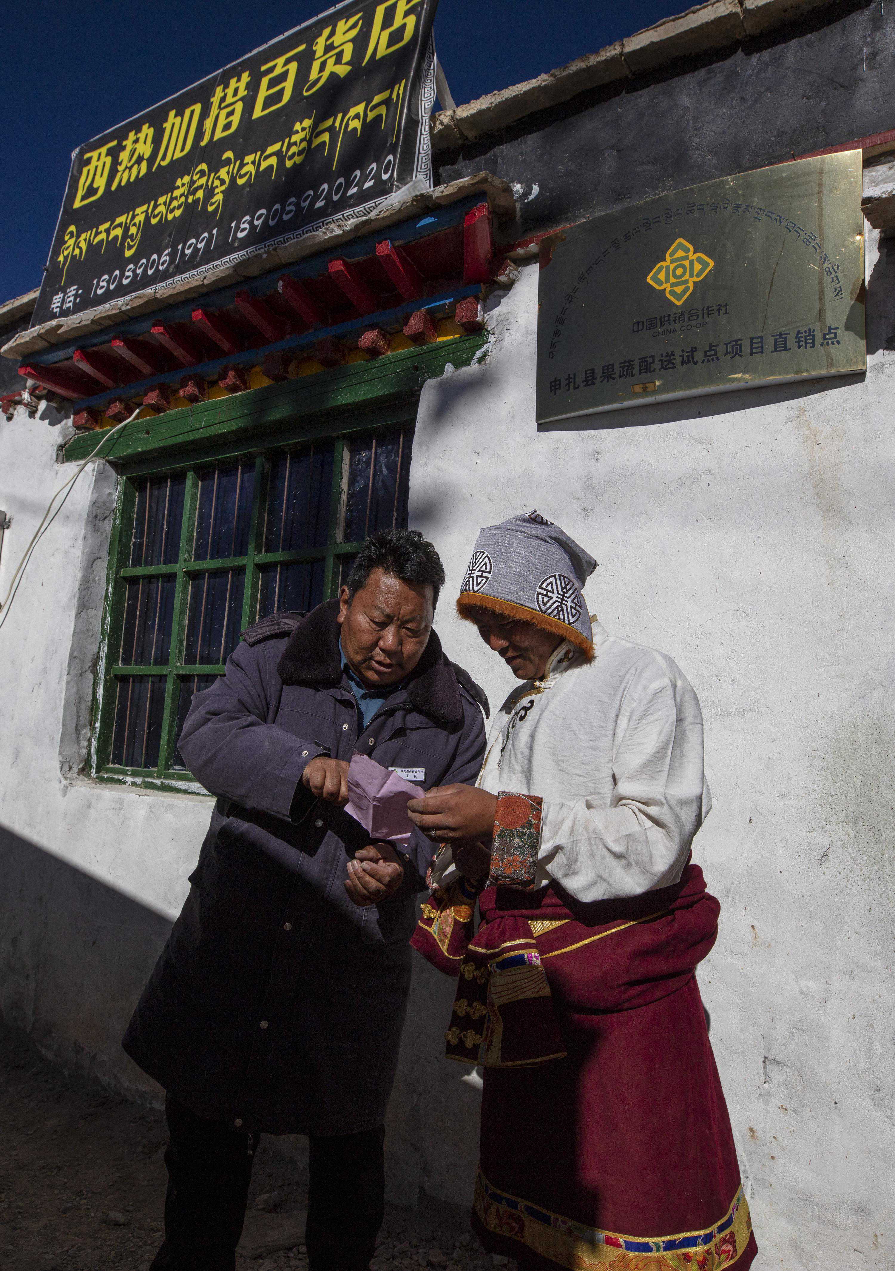 申扎县供销合作社的配送负责人吴瓦(左)与马跃乡贝嘎四村偏远乡镇果蔬配送试点项目直销点店主西热加措核对配送清单(1月5日摄)。新华社记者姜帆摄