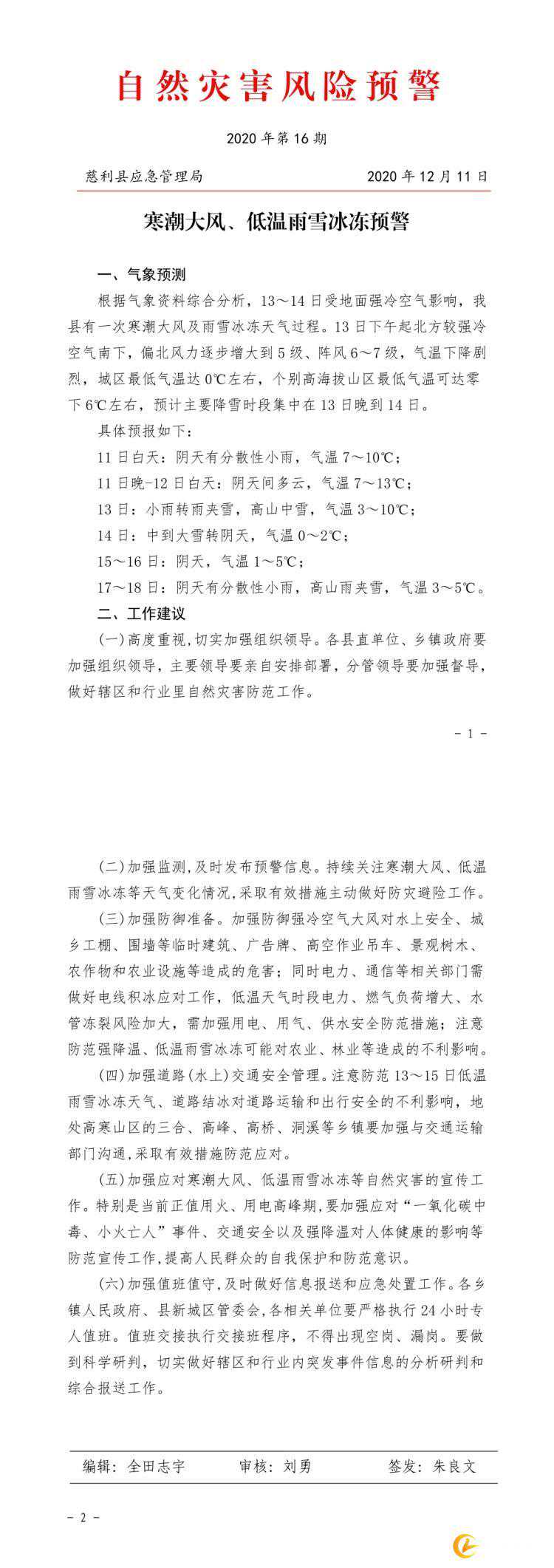 (五)加强应对寒潮大风、低温雨雪冰冻等自然灾害的宣传工作。特别是当前正值用火、用电高峰期,要加强应对“一氧化碳中毒、小火亡人”事件、交通安全以及强降温对人体健康的影响等防范宣传工作,提高人民群众的自我保护和防范意识。