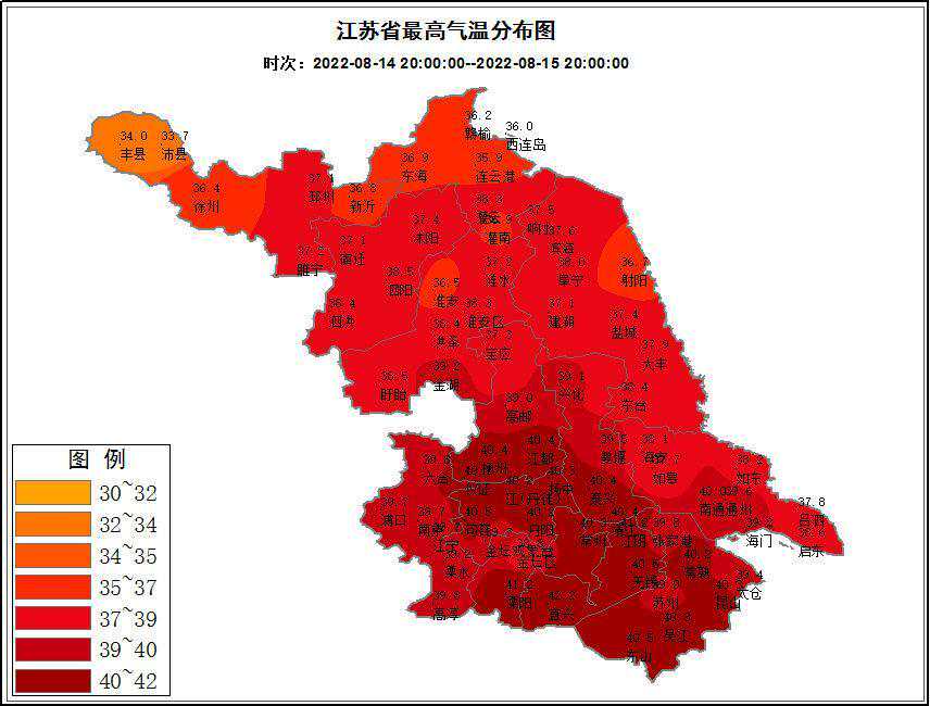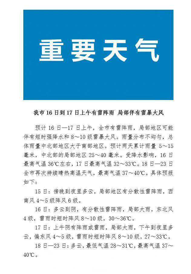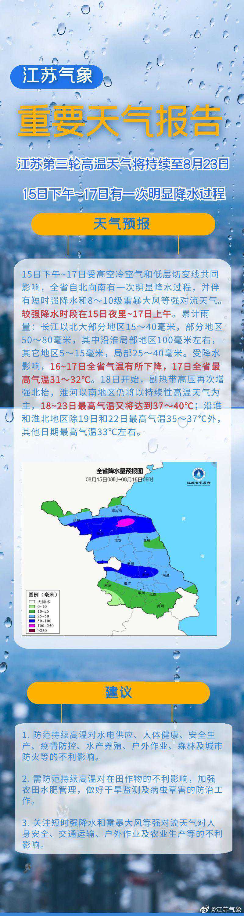 江苏省气象台还发布了重要天气报告:高温将持续至23日,15日下午~17日有一次明显降水过程,15日下午~17日受高空冷空气和低层切变线共同影响,全省自北向南有一次明显降水过程,并伴有短时强降水和8~10级雷暴大风等强对流天气。受降水影响,16~17日全省气温有所下降,17日全省最高气温31~32℃。18日开始,副热带高压再次增强北抬,淮河以南地区仍将以持续性高温天气为主,18~23日最高气温又将达到37~40℃;沿淮和淮北地区除19日和22日最高气温35~37℃外,其他日期最高气温33℃左右。