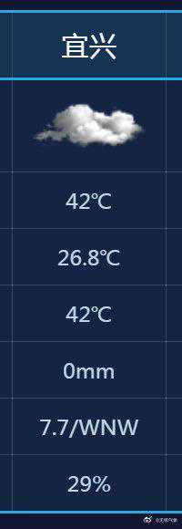 15日14时15分,江苏省气象台发布通报:宜兴气温升至42.0℃,再度刷新江苏历史最高温纪录!原纪录为三天前宜兴的41.8℃。