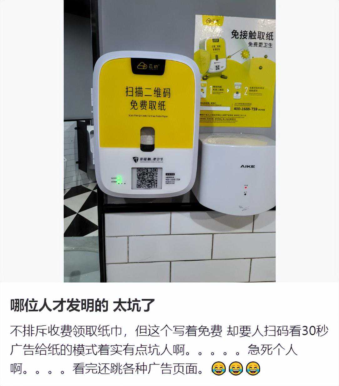 机器上设置了扫码、看广告等门槛,多个步骤操作下来,无形中给市民带来了不少麻烦,耽误了不少时间。便民设施引入广告要讲究时间场合,希望扫码取纸机能真正做到便捷高效,而不是成为另一种形式的“障碍”。