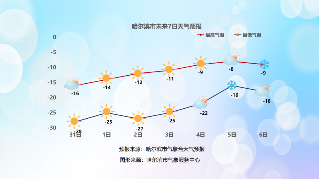 30日夜间至31日白天:30日夜间五常、尚志、延寿阴有中雪,个别乡镇可达大雪,其他区域阴有小雪,31日白天全市多云有分散性阵雪,偏北风1~3级,最低气温呼兰、木兰、巴彦、延寿-28~-26℃,其他区域-25~-23℃,最高气温-17~-14℃。