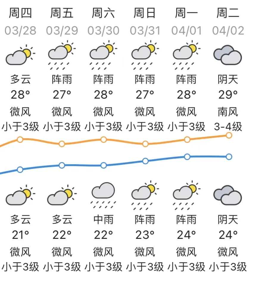 预计,28-29日我市云量增多,偶有阵雨;30日-4月2日受高空槽和低空急流影响,降雨趋于明显,局部雨势较大,可能伴有雷电和6~8级短时大风等强对流天气。目前已进入强对流多发季节,需注意防御局地雷电、短时大风和强降水等灾害。