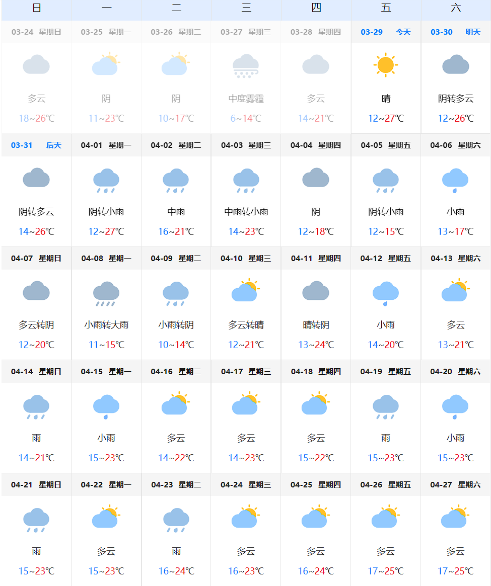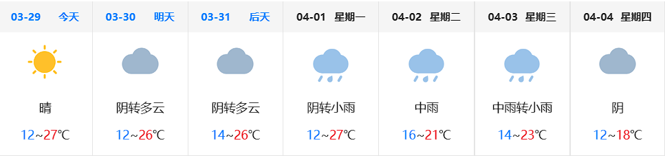 2024年03月30日:天气多云转阴,气温在16~29℃之间,西南风3~4级,空气质量优。