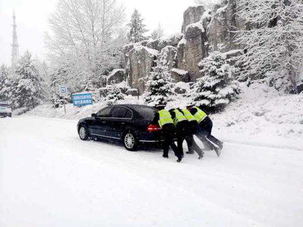由于降雪,导致道路积雪,出现不同程度的结冰情况,漠河交警部门提前上道疏导交通,提醒过往车辆减速慢行,为出现行走困难的车辆提供帮助,并向重点路段和陡坡路段铺撒防滑料。