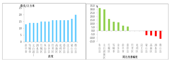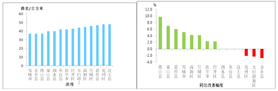 细颗粒物()浓度最好的县(市、区)是汶上县,为60微克/立方米;最差的是泗水县,为73微克/立方米;14县(市、区)同比改善幅度最大的是邹城市,为3.1%,最小的是经开区,同比恶化21.4%。