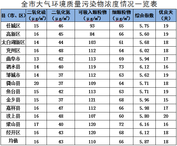 根据环境空气质量自动监测数据,济宁市对11月份环境空气质量状况及14县市区排名公布。