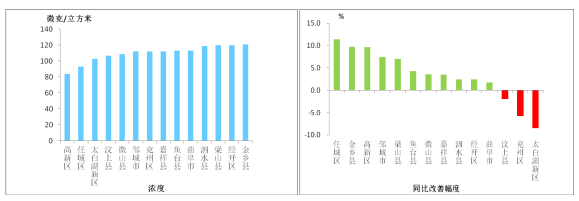 可吸入颗粒物(PM10)浓度最好的县(市、区)是高新区,为84微克/立方米;最差的是金乡县,为121微克/立方米;14县(市、区)同比改善幅度最大的是任城区,同比改善11.4%,最小的是太白湖新区,同比恶化8.4%。