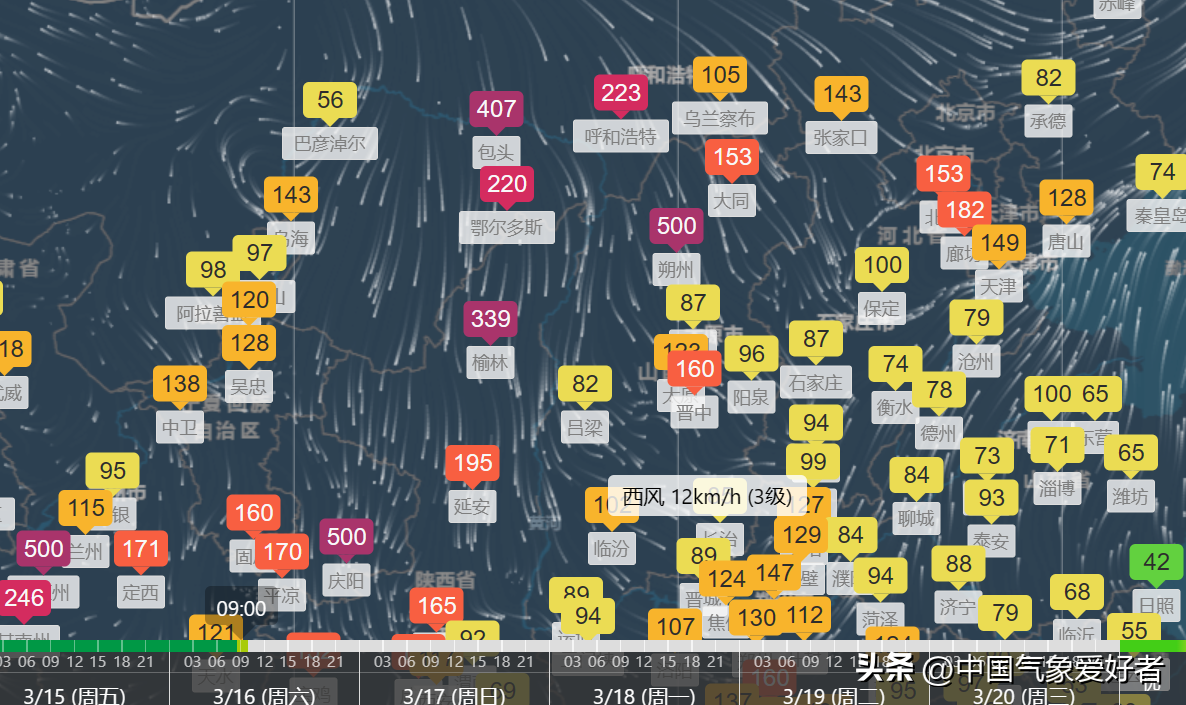 随着大风呼啸,春季最常见的一种天气已经启动——3月16日上午,内蒙古、陕西、山西、甘肃多地空气质量普遍糟糕,部分站点甚至出现了最严重的六级严重污染,达到了最高500的AQI数据上限,当中的主要污染物是高浓度的PM10,显示出沙尘天气已被蒙古气旋掀起,在北方多地扩散蔓延。