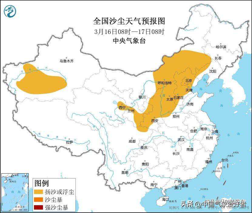 中央气象台3月16日06时继续发布沙尘暴蓝色预警:预计3月16日08时至17日08时,新疆南疆盆地、内蒙古中西部、青海东部、甘肃南部、陕西中北部、山西、河北中北部、北京、天津、辽宁西部等地的部分地区有扬沙或浮尘天气。