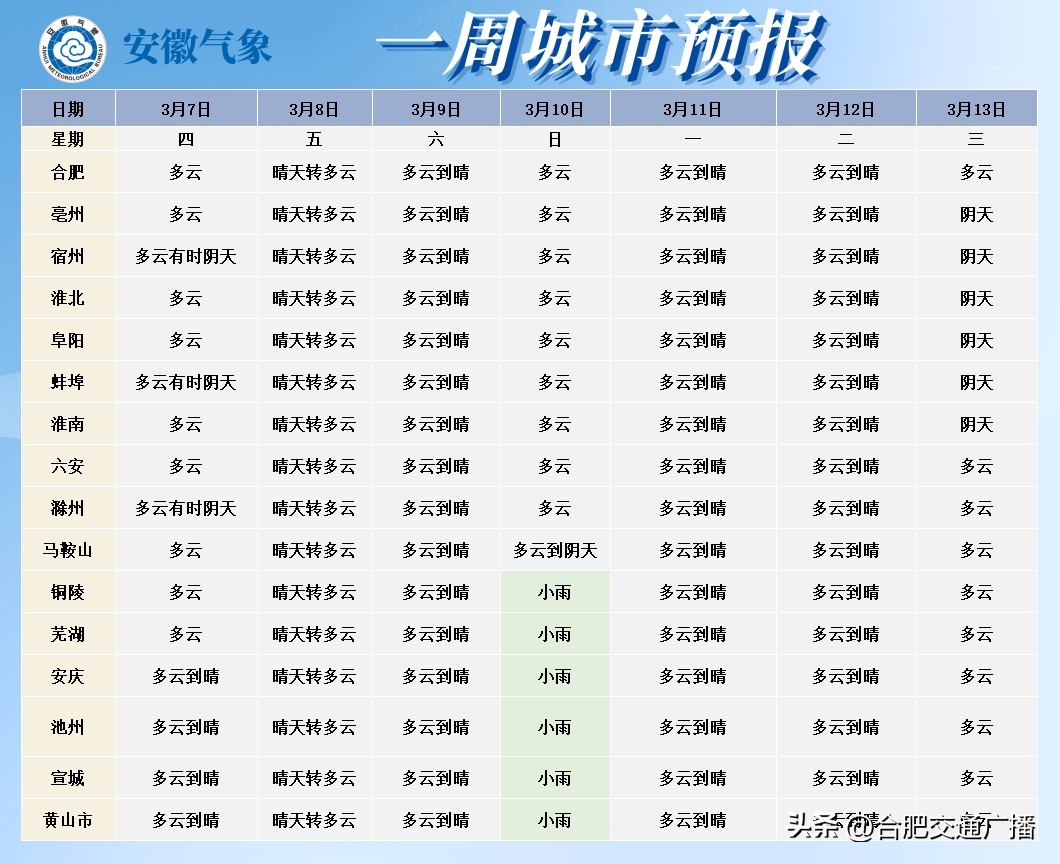 10日(周日):江北多云;沿江江南多云到阴天,部分地区有小雨。