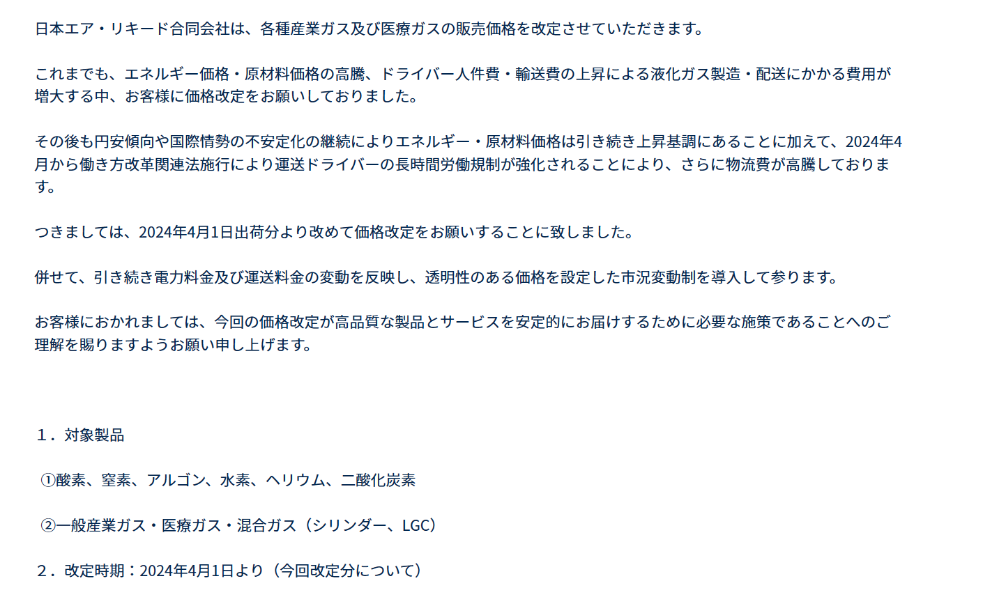 2024年3月1日,日本液化空气有限责任公司宣布将修改各种工业气体和医用气体的销售价格。过去,由于能源和原材料价格飙升,以及司机劳动力和运输成本上升,液化气生产和交付成本不断上升,我们一直在要求客户修改价格。