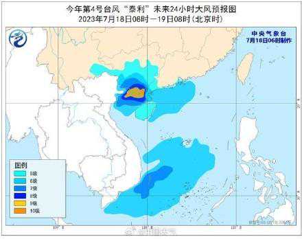大风预报:7月18日08时至19日08时,南海大部、北部湾、琼州海峡、西沙群岛、中沙群岛及黄岩岛附近海面、南沙群岛以及广东中西部沿海、广西沿海、海南岛沿海将有6-7级风,其中北部湾北部海域、广西沿海、雷州半岛西部沿海将有8-9级大风,“泰利”中心经过的附近海域或地区的风力有10级、阵风11-12级。另外,广东西南部、广西南部和海南岛将有5-6级风、阵风7-8级。