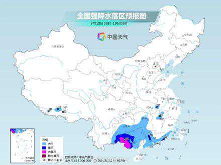 降水预报:7月18日08时至19日08时,广东大部、广西、福建东南部、湖南中南部、贵州南部、云南东南部等地的部分地区有大到暴雨,其中,广西西部、云南东南部等地的部分地区有大暴雨(100-180毫米);江西中北部、湖北东部、安徽西部等地的部分地区也有分散性大雨或暴雨。