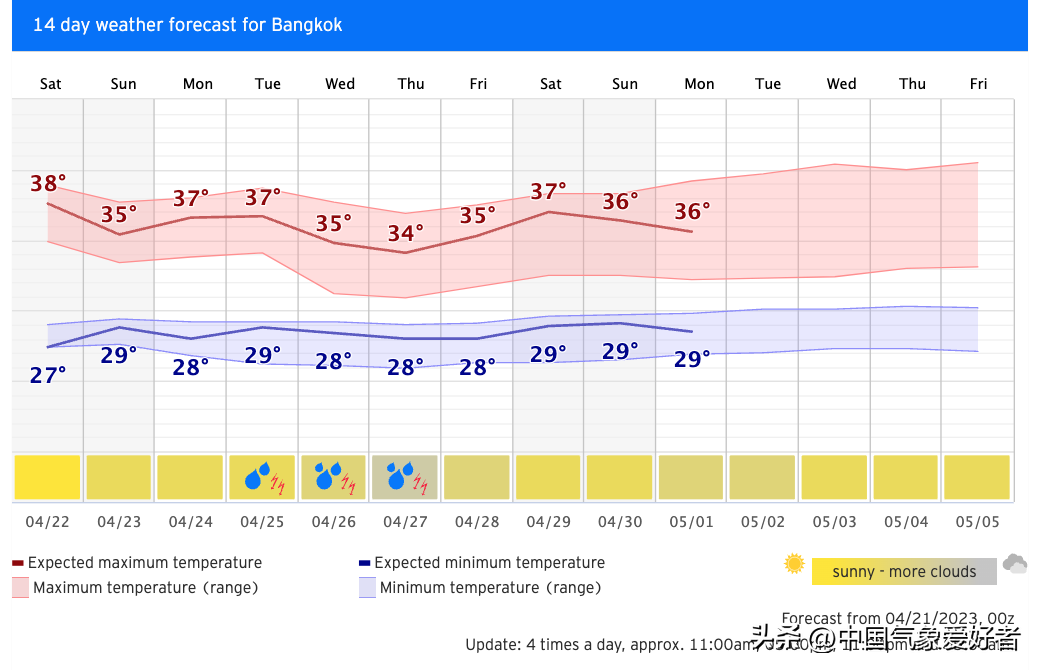 比如泰国曼谷,超级计算机的预报中指出,未来至少10天时间里,曼谷的最高气温还是会稳稳的处在35度及以上,即便有雷雨降温,最高气温也很难跌破35度线。对于泰国来说,现在其实也正是一年中最热的时候,而且一样炎热的5月还尚未到来,当地仍将持续笼罩在热浪当中。