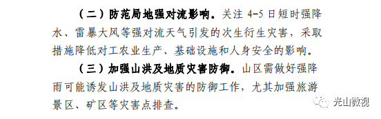 7月3日12时,光山县气象局发布重要天气报告:受3号台风“暹芭”和低层急流共同影响,预计4日傍晚到5日夜里我县有一次大到暴雨、局部大暴雨天气,累积降水量100毫米左右,局地130~170毫米,并伴有短时强降水、雷暴大风等强对流天气。此次过程影响范围广、降水量大、持续时间较长,需加强防范中小河流洪水、城区积水、农田渍涝、山洪地质灾害,做好强降水和强对流天气引发次生衍生灾害的防御工作。