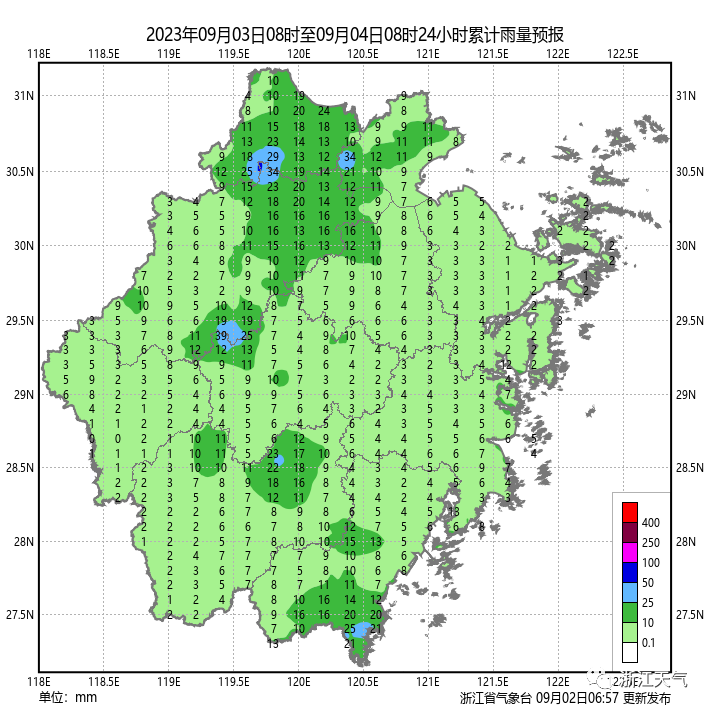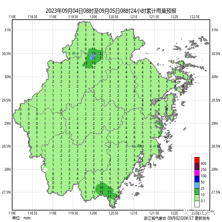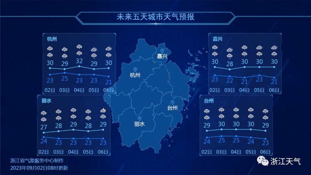 今天浙东地区多云转阴有阵雨或雷雨,部分中到大雨,局部暴雨;其它地区多云,午后有分散性阵雨。明天全省多云转阴有阵雨或雷雨,部分中雨局部大到暴雨,有雷雨地区可伴有短时暴雨。后天全省多云,有分散性阵雨。