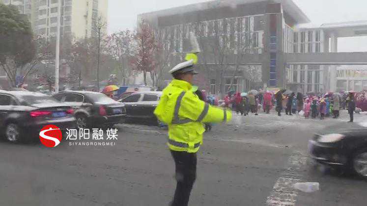 泗阳县交警大队三中队民警张海涛:今天雨雪天气,雪下的也比较大,造成天气寒冷,路面湿滑,我们的同事都坚守在岗位上,尤其到我们早上晚上高峰期,以及中午放学的时候,路上比较拥堵在此也是提醒各位家长接送学生的时候注意安全。