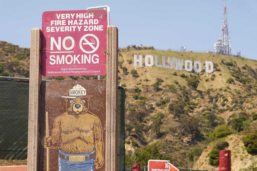 当地时间2023年7月12日,美国洛杉矶,好莱坞标志地标附近张贴了一个标有高温警告的标志。热浪滚滚,当日美国西南部部分地区的气温高达43°C。