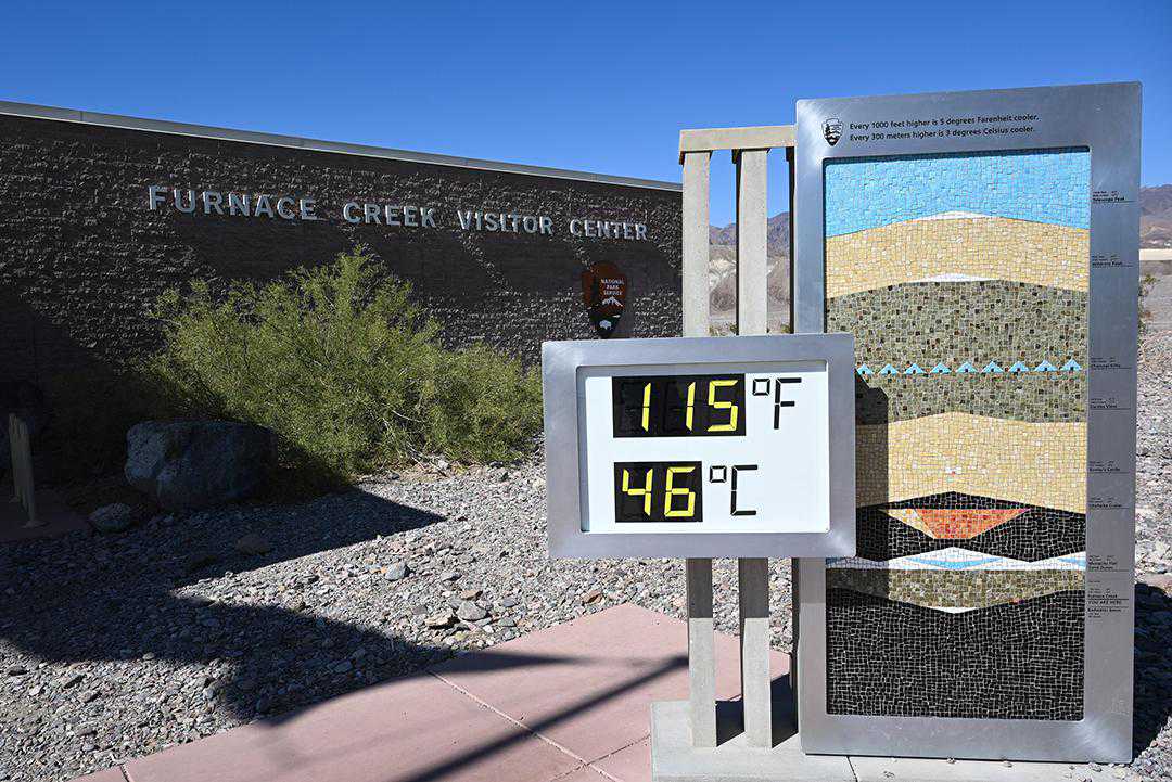 当地时间2023年7月9日,美国加利福尼亚州死亡谷,当日温度计上显示46℃。死亡谷被认为是地球上最热、最干燥的地方之一。