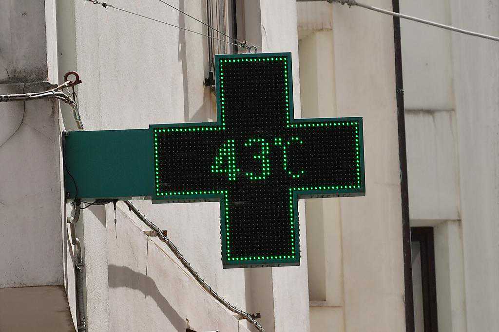当地时间2023年7月11日,意大利撒丁岛坦皮奥波萨尼亚,药店招牌上的温度计显示为43°C。