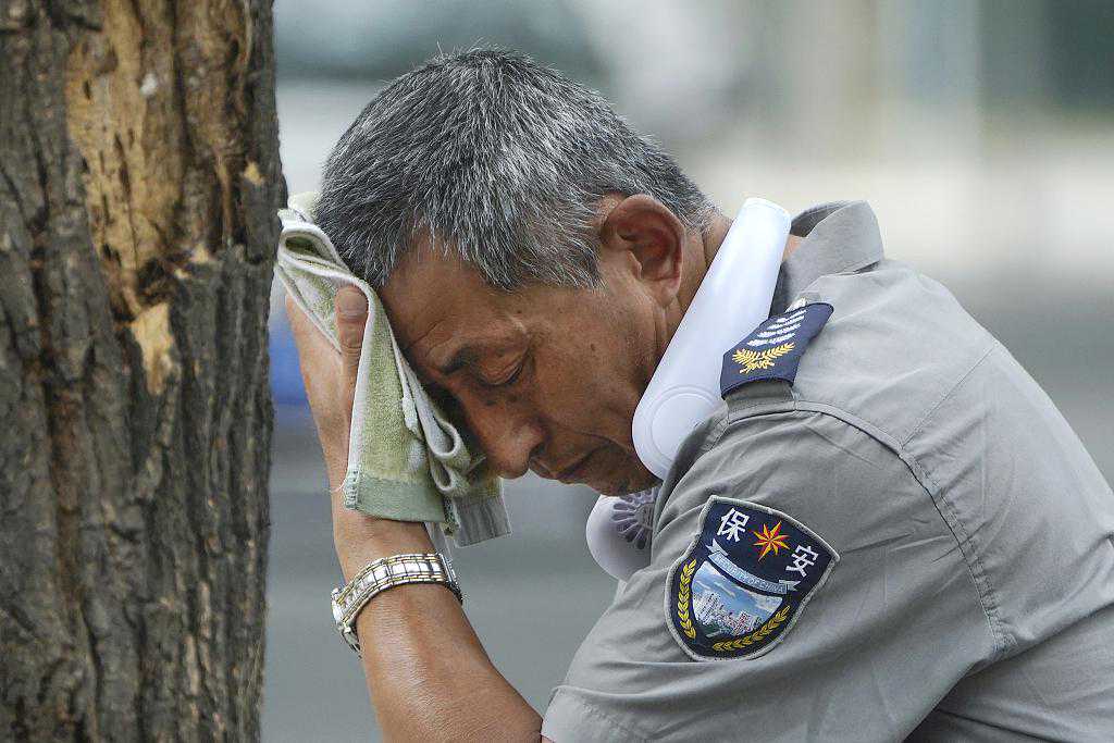 2023年7月3日,北京,一名保安脖子上挂着电风扇擦汗。