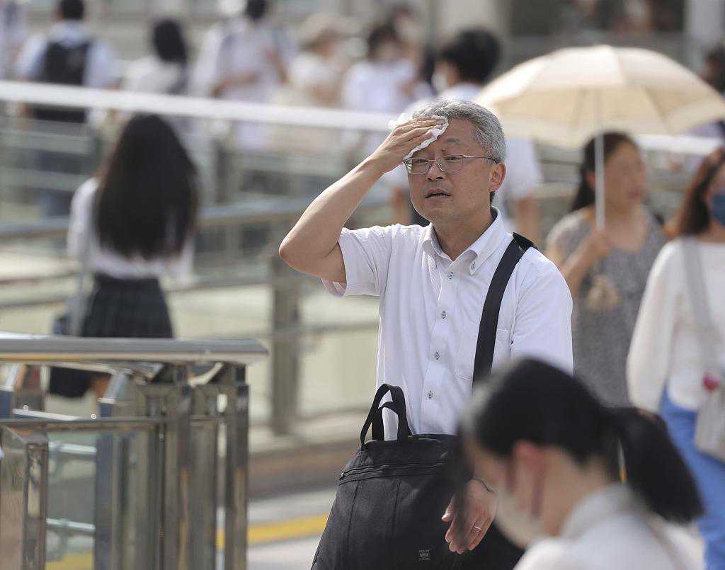 当地时间2023年7月12日,日本东京街头,人们一边在烈日下行走,一边擦汗。