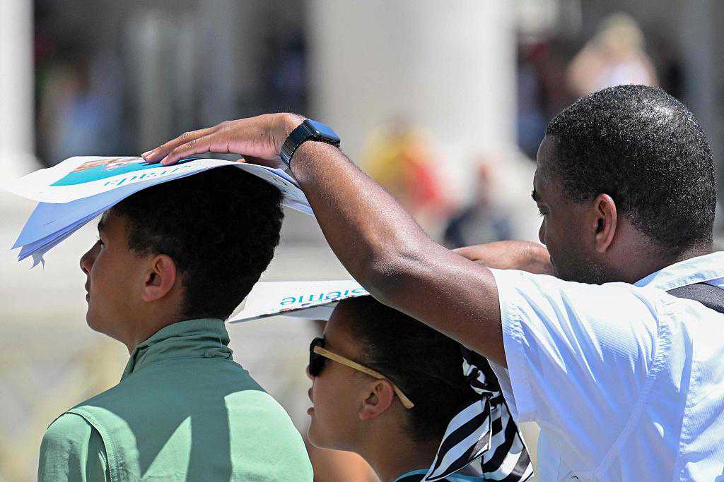 当地时间2023年7月9日,梵蒂冈,一名男子为家人遮阳。
