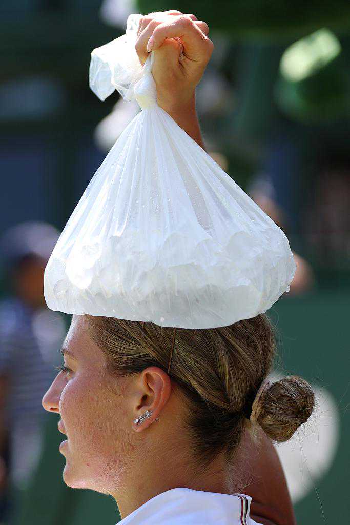 当地时间2023年7月7日,英国伦敦,2023温网女单次轮,乌克兰选手科斯秋克头顶冰袋降温。