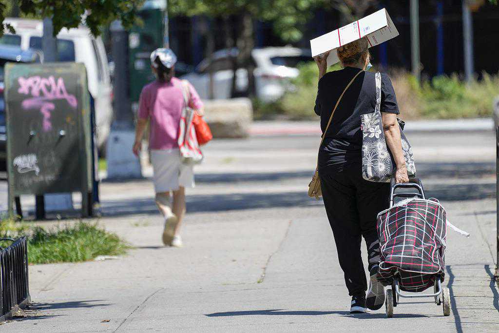 当地时间2023年7月6日,美国纽约,一名妇女在曼哈顿下东区走路时,用纸板遮阳。
