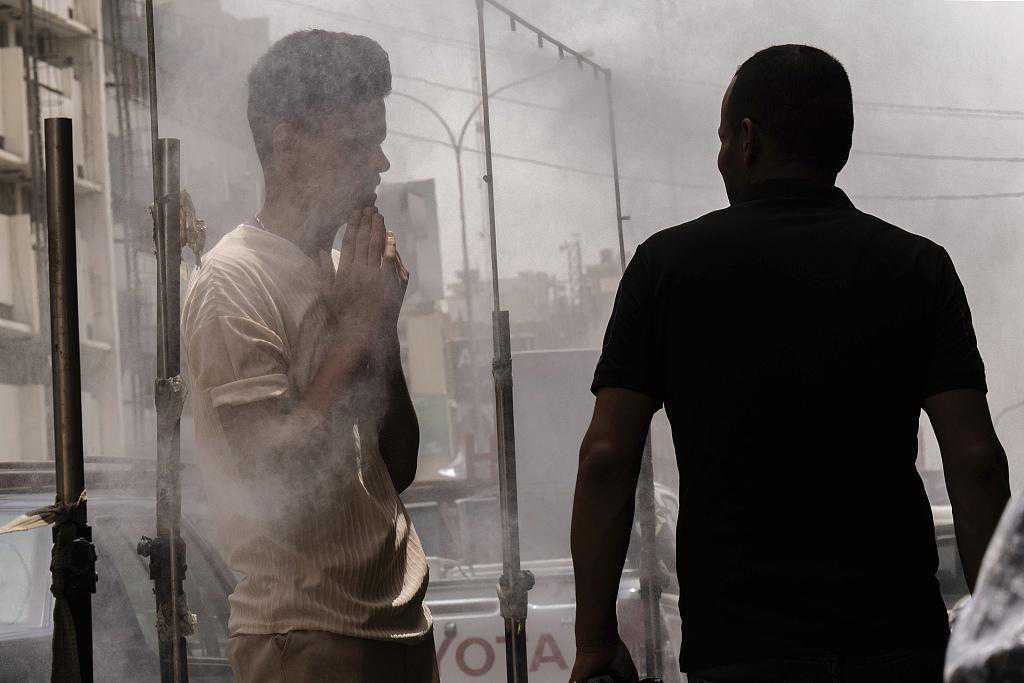 当地时间2023年7月6日,伊拉克巴格达,持续的高温,市民群众在街头水雾中降温消暑。