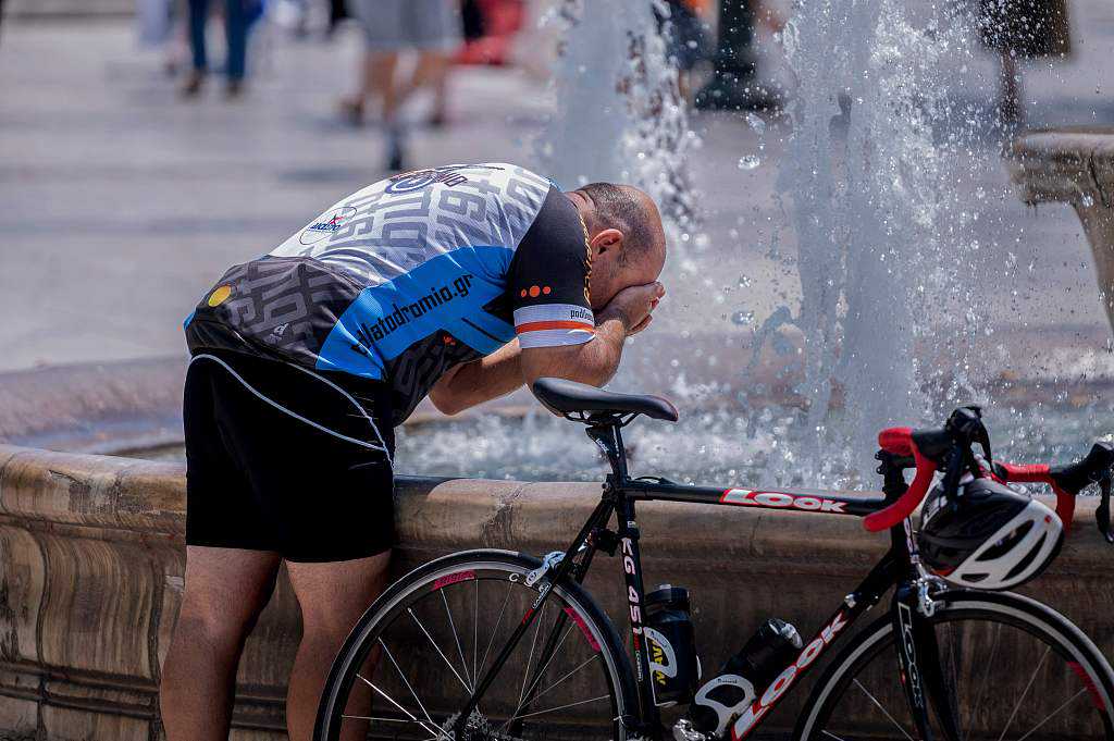 当地时间2023年7月12日,希腊雅典,高温天气下,一名骑自行车的人在市中心的一个喷泉旁洗脸降温。
