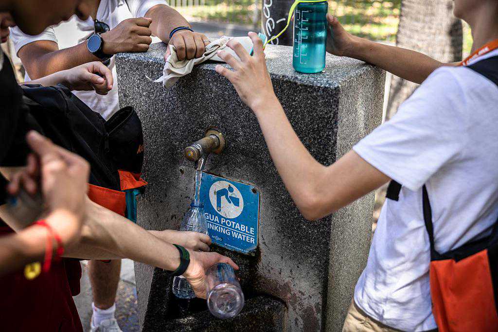 当地时间2023年7月5日,西班牙塞维利亚,高温天气下,市民游客们都在往水杯中补水。