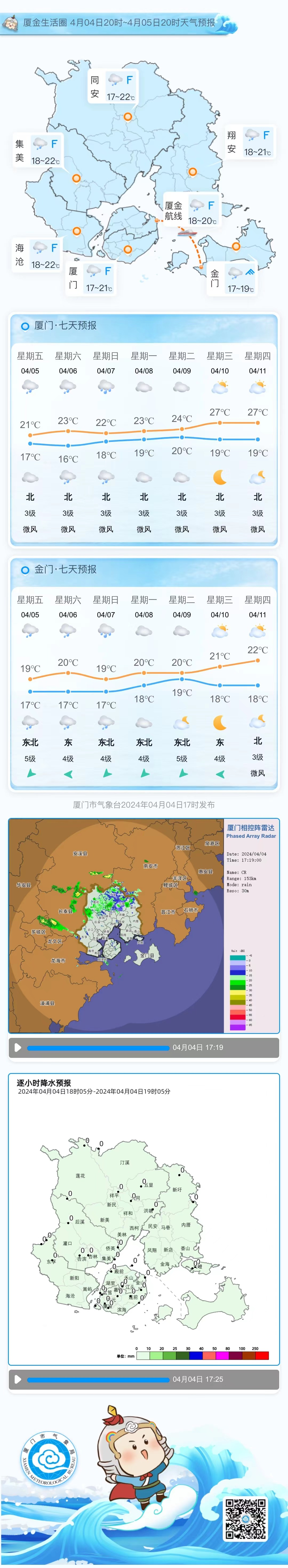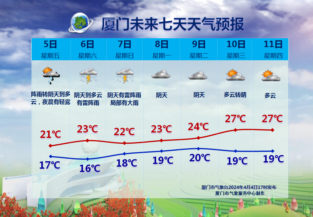 厦门地区天气:阴天到多云,有雷阵雨,东北风3~4级,气温:16~23℃;