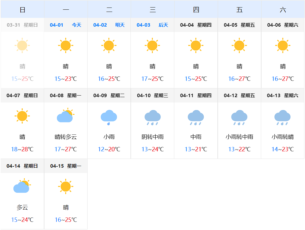 2024年4月1日:天气多云转晴,气温范围在15~25℃,西风4~5级,空气质量优。